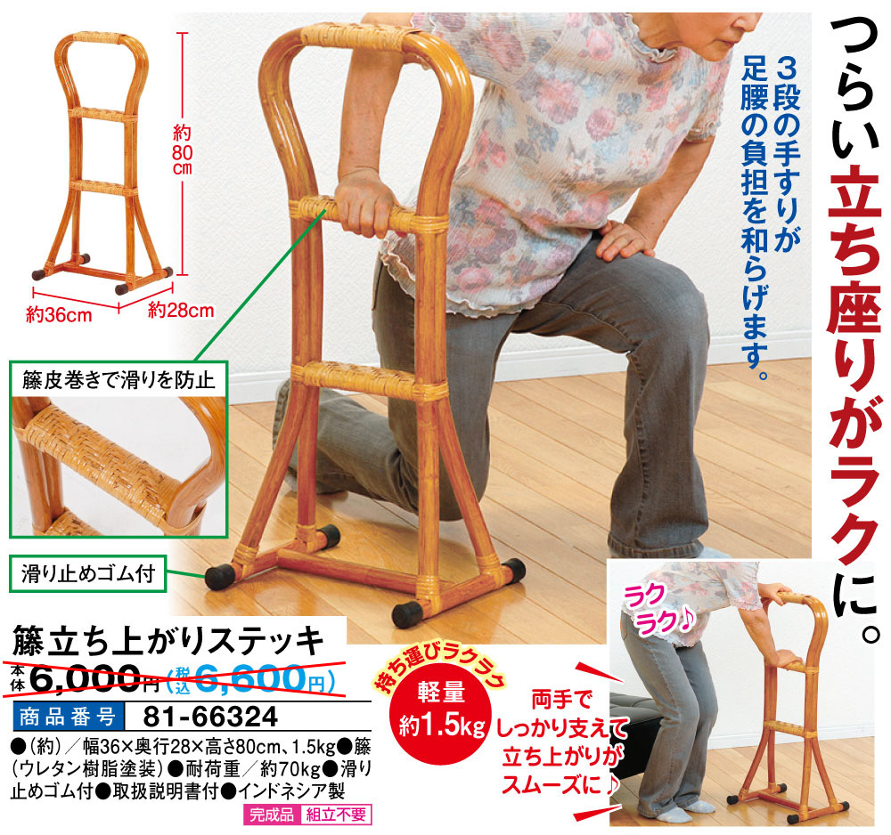 しっかり握れて立ち座りが楽になるステッキ! ひざや腰への負担を和らげ、楽に立ち上がれます。 3段階ある手すりで立ち上がりをサポート 持ち手は握り心地が優しい布地。(着脱でき洗濯もOK) ラバーキャップで滑りにくい ●軽量:持ち運びラクラク