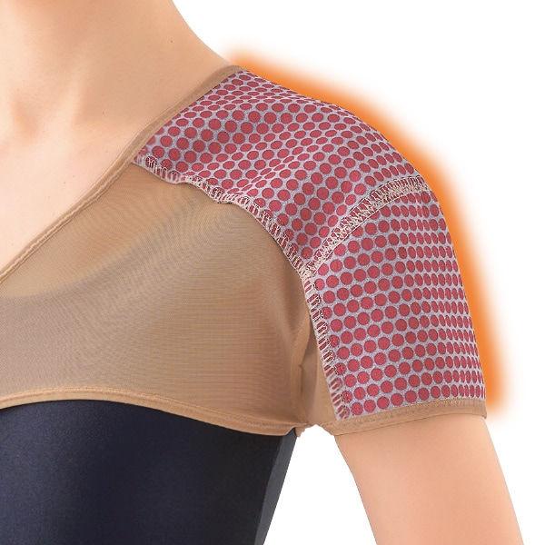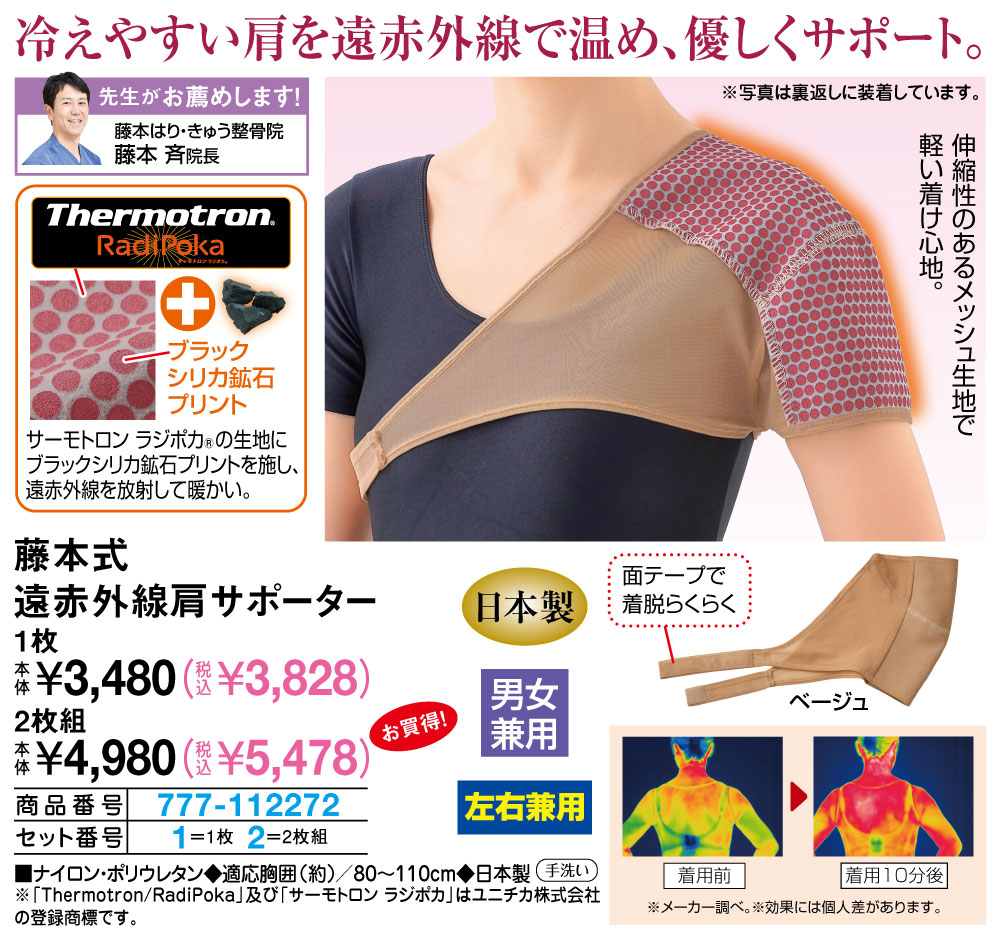 冷えやすい肩を遠赤外線で温め、優しくサポート! 伸縮性のあるメッシュ生地で軽い着け心地。 面テープで着脱らくらく 【先生がお薦めします!】 藤本はり・きゅう整骨院 藤本 斉院長 【Thermotron(R) RadiPoka】 ●ブラックシリカ鉱石プリント サーモトロン ラジポカ(R)の生地にブラックシリカ鉱石プリントを施し、遠赤外線を放射して暖かい。 ●男女兼用 ●左右兼用