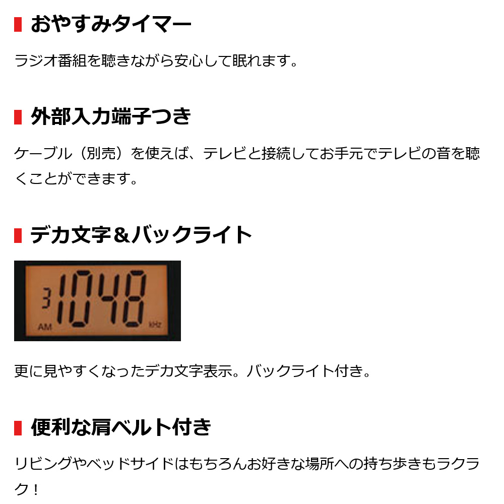 大音量(2W+2W)で8cm×2の高音質のステレオスピーカー搭載。 FM補完放送などの放送をステレオで聴くことができます。 サイドに便利なLEDライトを搭載。非常時や暗がりに安心です。 ◎おやすみタイマー ◎外部入力端子つき ◎デカ文字&バックライト ◎便利な肩ベルト付き