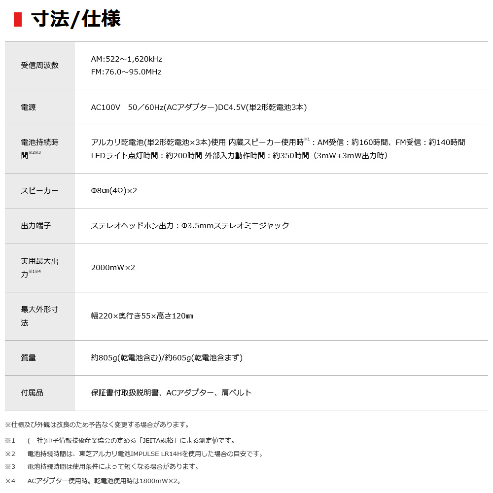 【受信周波数】<AM>522~1620kHz <FM>76.0~95.0MHz 【電源】AC100V 50/60Hz(ACアダプター)/DC4.5V(単2形乾電池3本) 【スピーカー】Φ8㎝(4Ω)×2 【出力端子】ステレオヘッドホン出力:Φ3.5mmステレオミニジャック 【実用最大出力】2000mW×2(※1※4) 【最大外形寸法】幅220×奥行55×高さ120mm 【質量(約)】805g(乾電池含む)/605g(乾電池含まず) 【付属品】保証書付取扱説明書、ACアダプター、肩ベルト