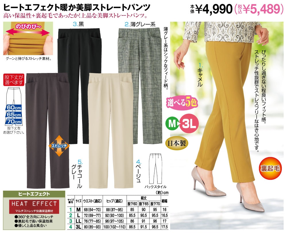 高い保温性+裏起毛であったか!上品な美脚ストレートパンツ! ぴったりし過ぎない程良いフィット感。 ストレッチ性抜群でストレスフリーなはき心地です。 【ヒートエフェクト】 マルチストレッチ快適保温素材 ●360°全方向にストレッチ ●裏起毛で高い保温効果 ●優しく上品な風合い ●グーンと伸びるストレッチ素材。 ●薄グレー系はシックなツィード柄。 ●ストレッチ ●裏起毛 ●選べる5色 ●M~3L
