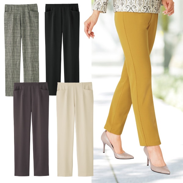 股下60cm【サイズ(約)】 ウエスト(適応)、ヒップ(適応)、総丈、裾幅 <M>68(64~70)cm、88(87~95)cm、85cm、16cm <L>72(69~77)cm、92(92~100)cm、85.5cm、16.5cm <LL>76(77~85)cm、96(97~105)cm、86cm、17cm <3L>80(85~93)cm、100(102~110)cm、86.5cm、17.5cm 股下65cm【サイズ(約)】 ウエスト(適応)、ヒップ(適応)、総丈、裾幅 <M>68(64~70)cm、88(87~95)cm、90cm、16cm <L>72(69~77)cm、92(92~100)cm、90.5cm、16.5cm <LL>76(77~85)cm、96(97~105)cm、91cm、17cm <3L>80(85~93)cm、100(102~110)cm、91.5cm、17.5cm 股下70cm【サイズ(約)】 ウエスト(適応)、ヒップ(適応)、総丈、裾幅 <M>68(64~70)cm、88(87~95)cm、95cm、16cm <L>72(69~77)cm、92(92~100)cm、95.5cm、16.5cm <LL>76(77~85)cm、96(97~105)cm、96cm、17cm <3L>80(85~93)cm、100(102~110)cm、96.5cm、17.5cm ■表地:ポリエステル89%・ポリウレタン11% ◆ウエスト総ゴム、両側ポケット付 ◆裏地なし ◆日本製