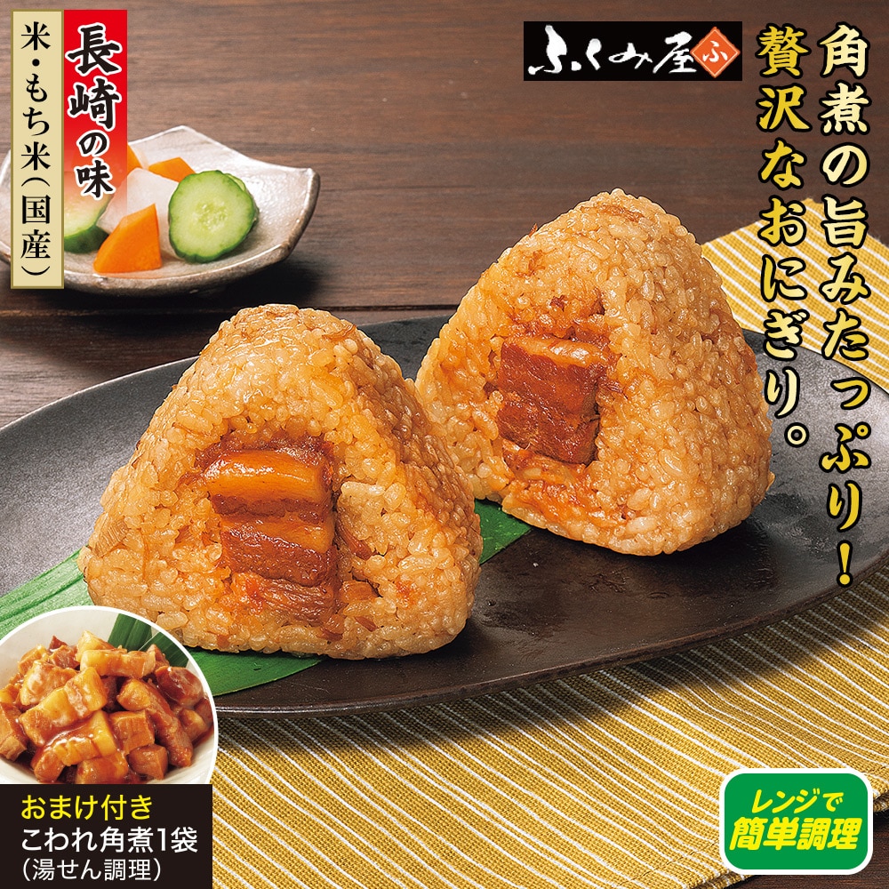 【米・もち米(国産)】 長崎のご当地おにぎり! じっくり手間ひまかけて煮込んだ特製角煮を贅沢に使用しました。 ごはんにもほぐした角煮を混ぜています。 おまけ付き こわれ角煮1袋(湯せん調理) レンジで簡単調理。