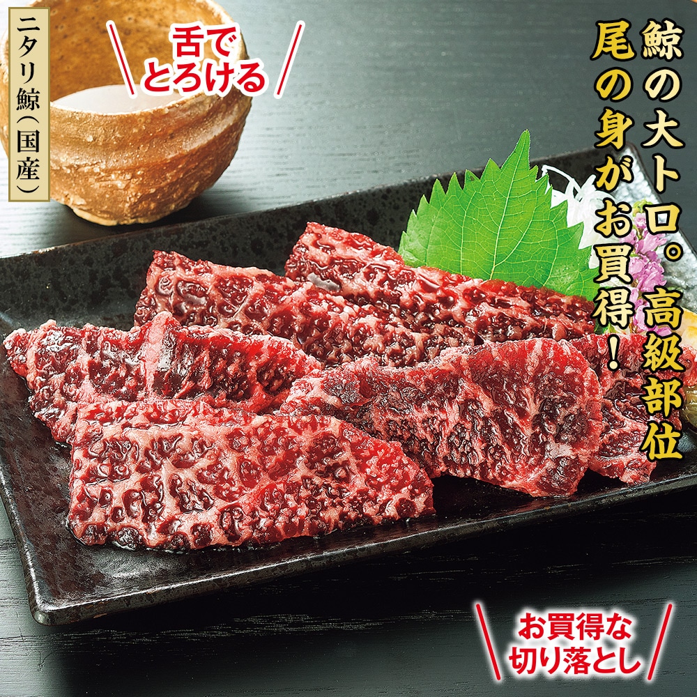 ニタリ鯨の背びれから尾にかけての希少部位。 切り落としなので形は不揃いですが、脂がしっかりのった旨さは絶品です。