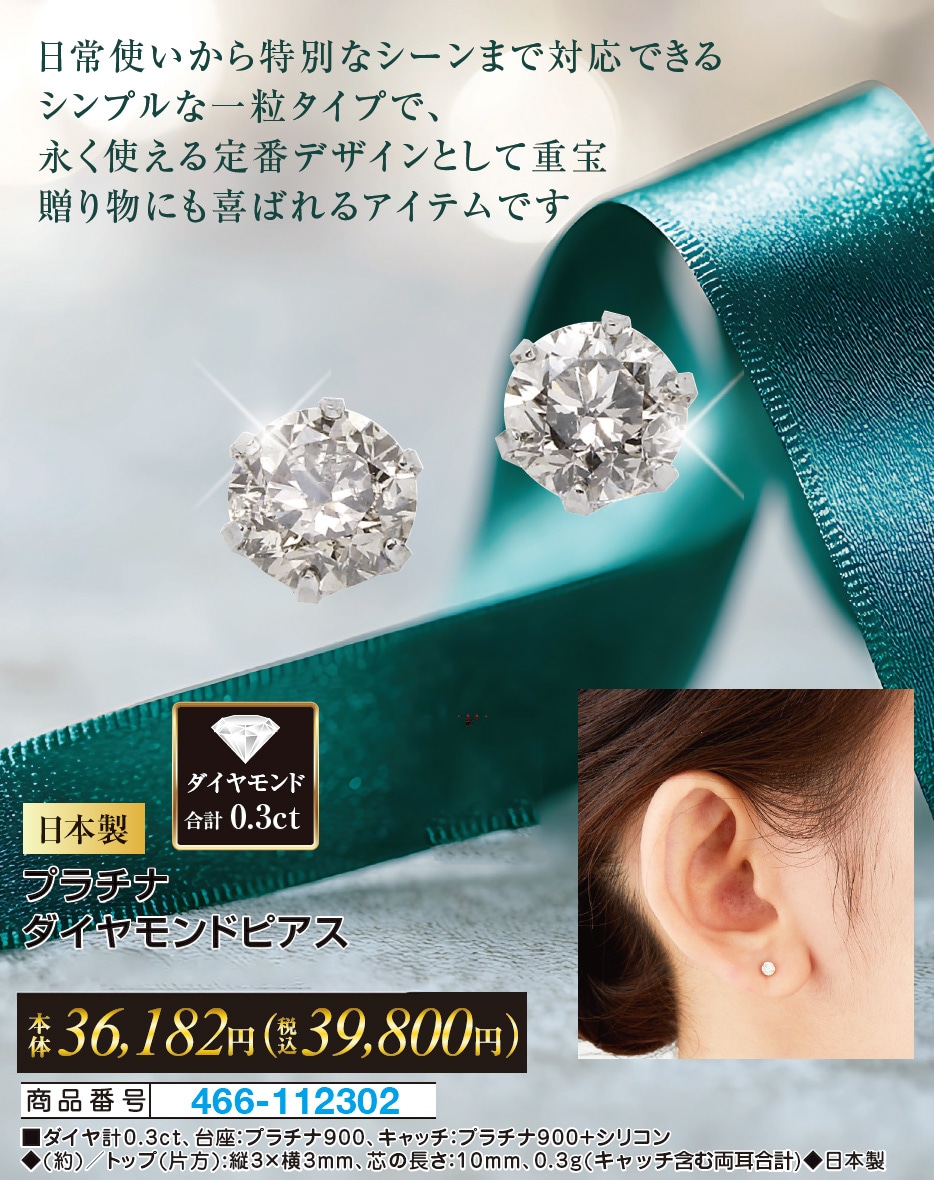 ●ダイヤ計0.3ct、台座:プラチナ900、キャッチ:プラチナ900+シリコン ◆(約)/トップ(片方):縦3×横3mm、芯の長さ:10mm、0.3g(キャッチ含む両耳合計) ◆日本製