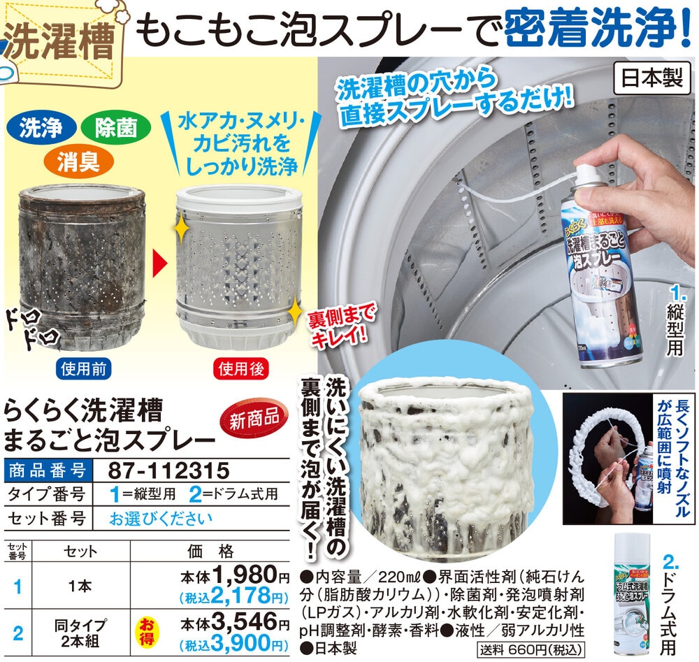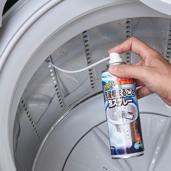 洗濯槽もこもこ泡スプレーで密着洗浄! 大掃除がはかどる!お役立ちアイテム 洗濯槽の穴から直接スプレーするだけ! 長くソフトなノズルが広範囲に噴射 裏側までキレイ!洗いにくい洗濯槽の裏側まで泡が届く! 水アカ・ヌメリ・カビ汚れをしっかり洗浄 ●洗浄 ●除菌 ●消臭