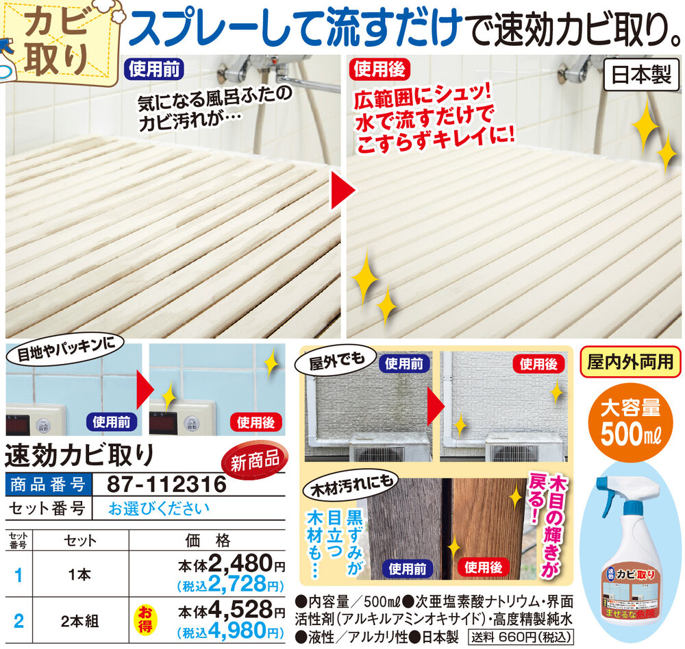カビ取りスプレーして流すだけで速効カビ取り! 大掃除がはかどる!お役立ちアイテム 気になる風呂ふたのカビ汚れが… 広範囲にシュッ!水で流すだけでこすらずキレイに! ●目地やパッキンに ●屋外でも ●屋内外両用 ●木材汚れにも 黒ずみが目立つ木材も…木目の輝きが戻る! ●大容量500mL