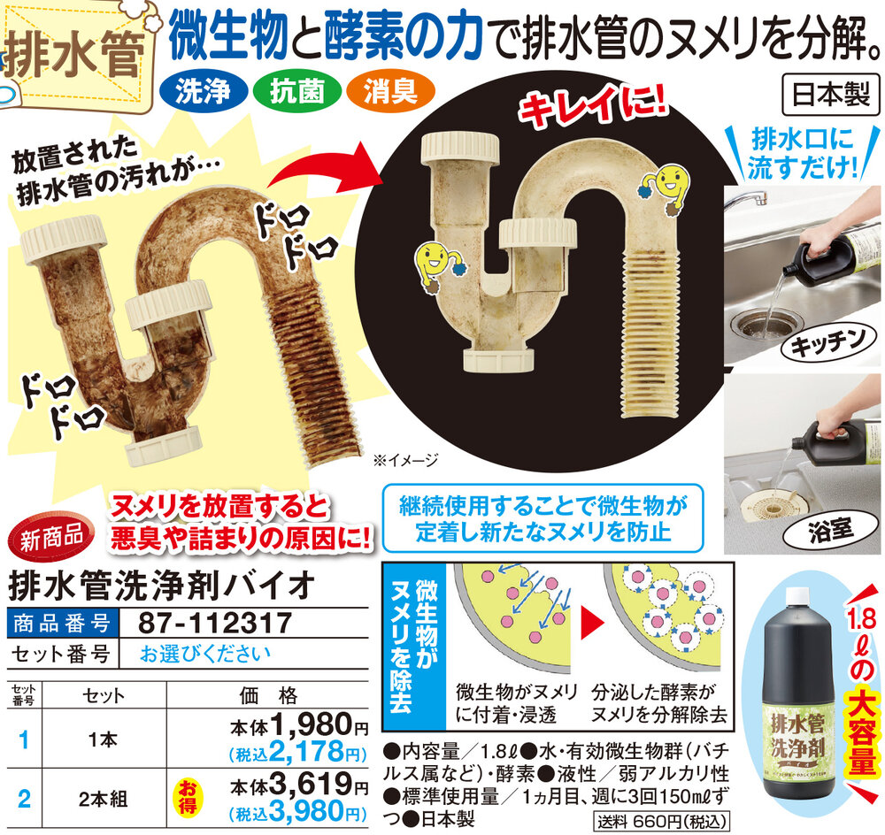 排水管微生物と酵素の力で排水管のヌメリを分解! 大掃除がはかどる!お役立ちアイテム ヌメリを放置すると悪臭や詰まりの原因に! 排水口に流すだけ! 放置された排水管の汚れが…キレイに! 継続使用することで微生物が定着し新たなヌメリを防止 【微生物がヌメリを除去】 微生物がヌメリに付着・浸透 →分泌した酵素がヌメリを分解除去 ●キッチン ●浴室 ●洗浄 ●抗菌 ●消臭 ●1.8Lの大容量