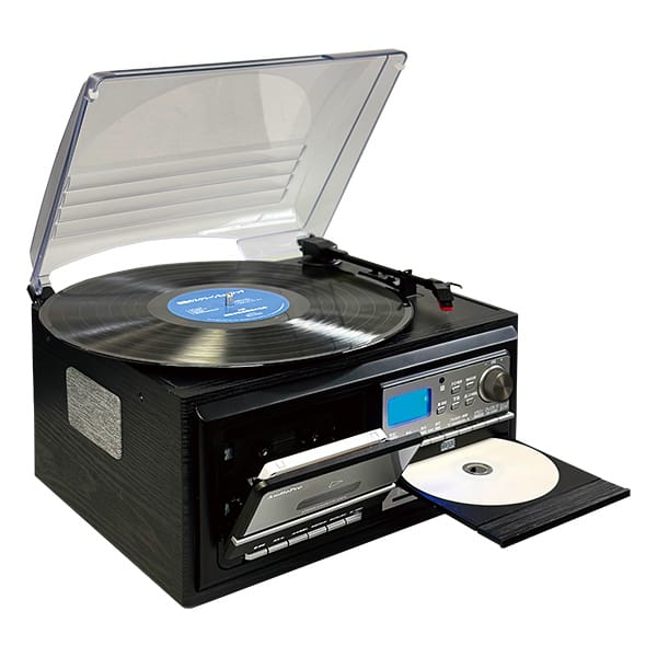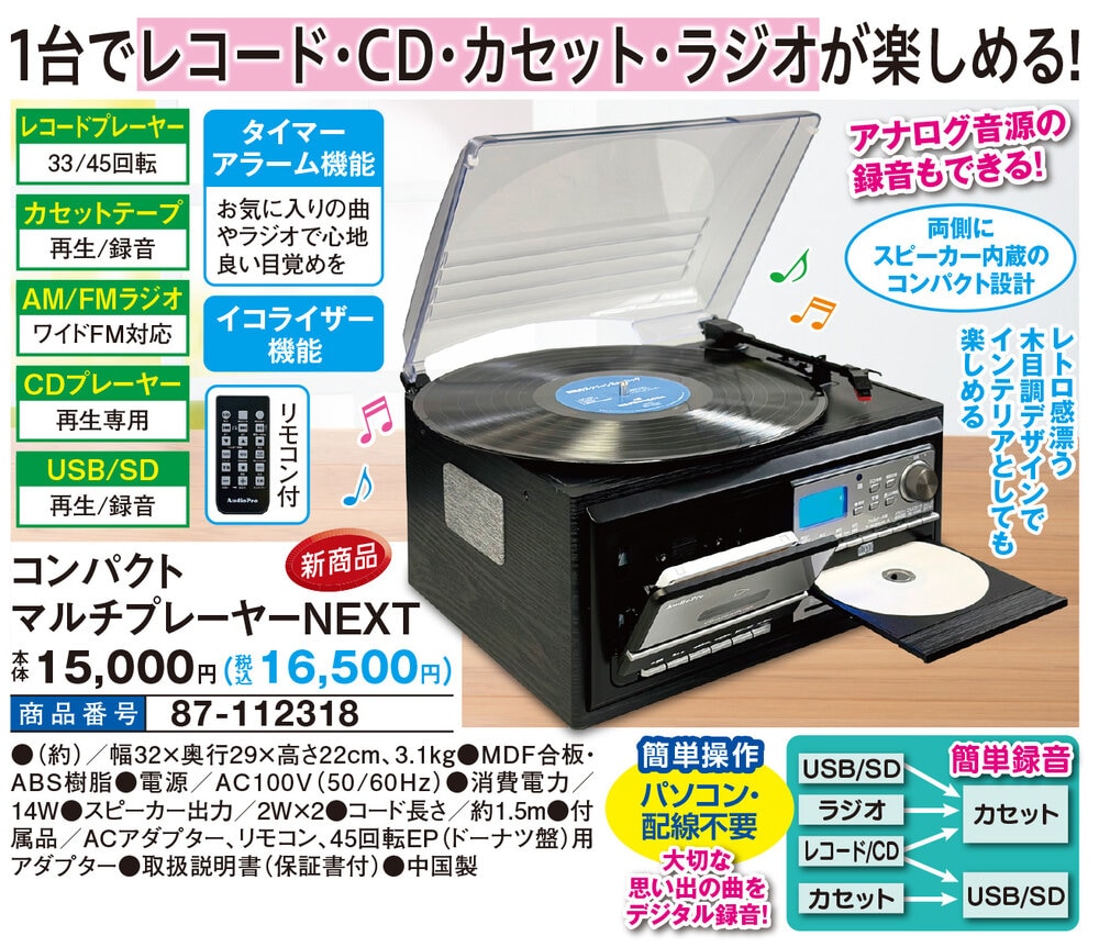 1台でレコード・CD・カセット・ラジオが楽しめる! アナログ音源の録音もできる! 両側にスピーカー内蔵のコンパクト設計 レトロ感漂う木目調デザインでインテリアとしても楽しめる 簡単操作 パソコン・配線不要 大切な思い出の曲をデジタル録音! ■タイマーアラーム機能 お気に入りの曲やラジオで心地良い目覚めを ■イコライザー機能 ■リモコン付 ●レコードプレーヤー:33/45回転 ●カセットテープ:再生/録音 ●AM/FMラジオ:ワイドFM対応 ●CDプレーヤー:再生専用 ●USB/SD:再生/録音