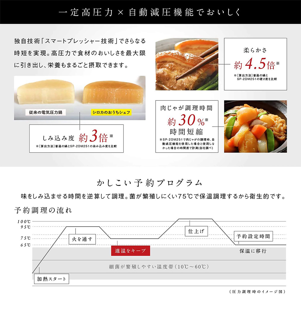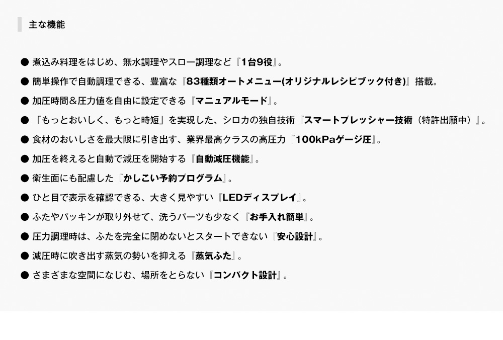 ◎メーカー史上最高クラスの高圧力でほったらかし・美味しい・時短の一石三鳥 ◎ボタンを押すだけ!ほったらかしで料理が出来上がる電気圧力鍋 ◎メーカー史上最高クラスの高圧力+独自機能でさらに美味しく・時短に ◎圧力調理以外にも使える!1台9役のシェフ! ◎かしこい予約プログラムで安心して予約調理も ◎レシピブック付き!