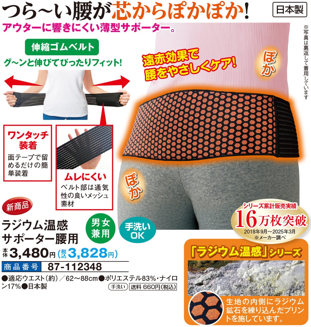つら~い腰が芯からぽかぽか! 省エネしながらぽかぽか生活。 アウターに響きにくい薄型サポーター。 遠赤効果で腰をやさしくケア! 【伸縮ゴムベルト】 グ~ンと伸びてぴったりフィット! 【ワンタッチ装着】 面テープで留めるだけの簡単装着 【ムレにくい】 ベルト部は通気性の良いメッシュ素材 【「ラジウム温感」シリーズ】 生地の内側にラジウム鉱石を練り込んだプリントを施しています。 ●男女兼用