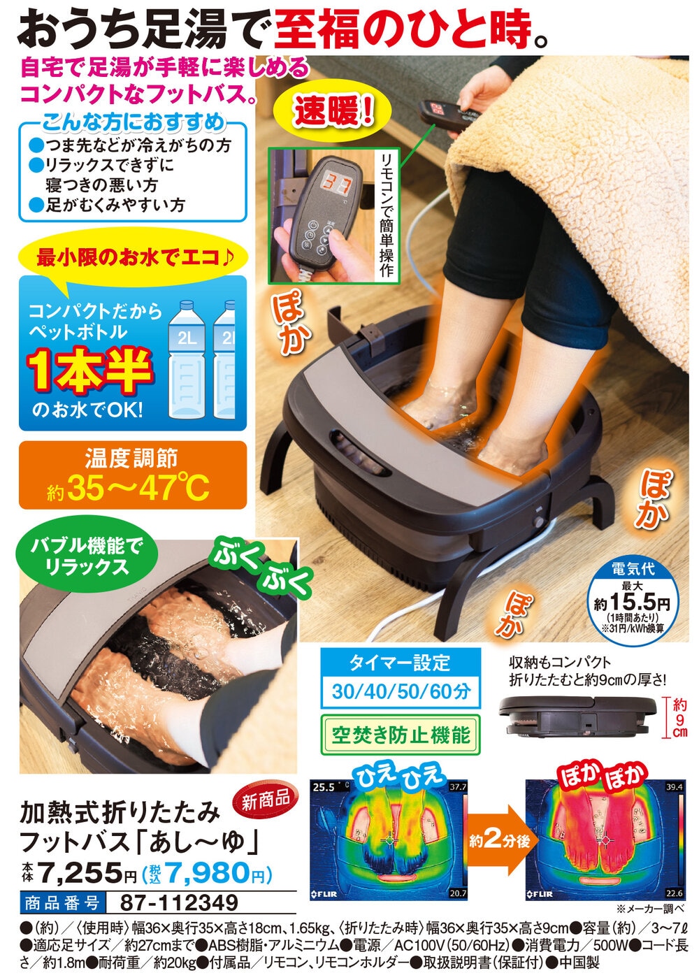 おうち足湯で至福のひと時! 自宅で足湯が手軽に楽しめるコンパクトなフットバス。 【こんな方におすすめ】 ●つまさきなどが冷えがちの方。 ●リラックスできずに寝つきの悪い方。 ●足がむくみやすい方。 速暖!リモコンで簡単操作。 温度調節 約35~47℃ バブル機能でリラックス。 タイマー設定 30/40/50/60分。 空焚き防止機能。 最小限のお水でエコ♪ コンパクトだからペットボトル1本半のお水でOK! 収納もコンパクト。 折りたたむと約9cmの厚さ!