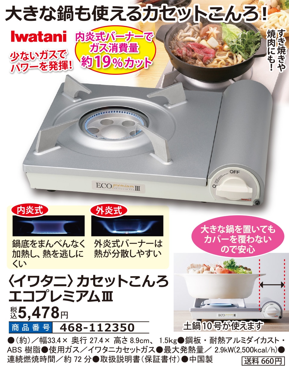 大きな鍋を置いてもカバーを覆わないので安心。 内炎式バーナーでガス消費量約19%カット。 少ないガスでパワーを発揮! すき焼きや焼肉にも! 内炎式 鍋底をまんべんなく加熱し、熱を逃しにくい。 外炎式 外炎式バーナーは熱が分散しやすい。 土鍋10号が使えます。
