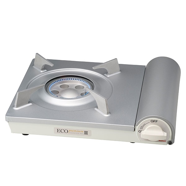 ●(約)/幅33.4×奥行27.4×高さ8.9cm、1.5kg ●鋼板・耐熱アルミダイカスト・ABS樹脂 ●使用ガス/イワタニカセットガス ●最大発熱量/2.9kW(2500kcal/h) ●連続燃焼時間/約72分 ●取扱説明書(保証書付) ●中国製