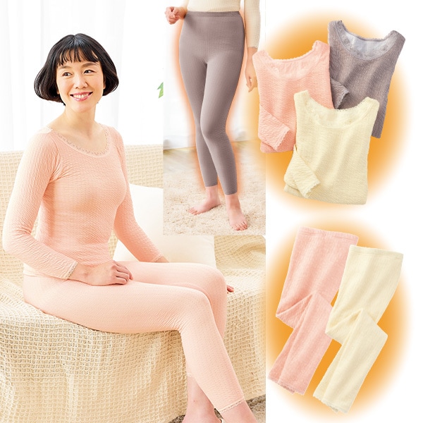 ふんわり柔らか、のびのび暖かインナー! よく伸びて優しいフィット感の、凹凸あるリップルニット素材。 衿元と袖口は可愛いレース仕様。 アウターから見えにくい広めの衿ぐりと8分袖。 お腹も腰も暖かい、安心の深ばきタイプ。 裾はレース仕様でソフトな肌当たり 嬉しいゴム取替口付 二重になった生地の間の空気層が暖かさをキープ。 ●同アイテム同サイズ3色セット ●綿100%(表面)