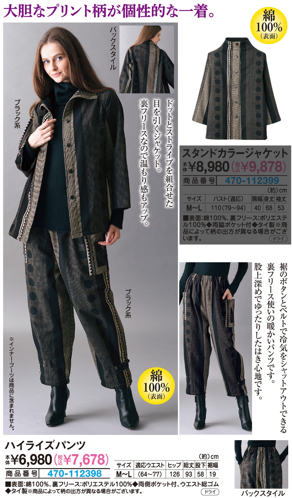 大胆なプリント柄が個性的な一着。 裾のボタンとベルトで冷気をシャットアウトできる裏フリース使いの暖かいパンツです。 股上深めでゆったりしたはき心地です。 綿100%(表面)