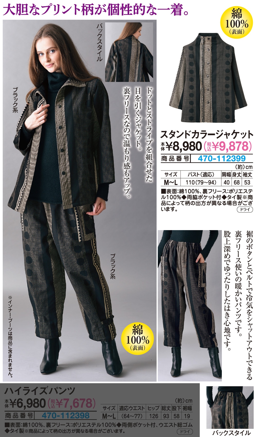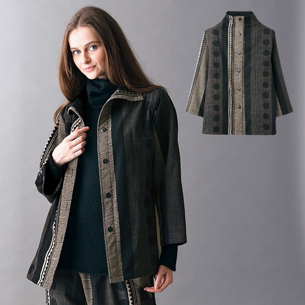 ドットとストライプを組合せた目を引くジャケット。 裏フリースなので温もり感もアップ。 綿100%(表面)