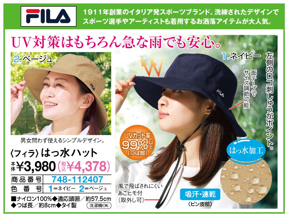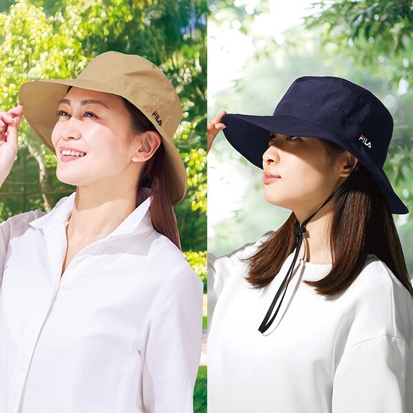 UV対策はもちろん急な雨でも安心! 【FILA(フィラ)】 1911年創業のイタリア発スポーツブランド。洗練されたデザインでスポーツ選手やアーティストも着用するお洒落アイテムが大人気。 左側のロゴ刺しゅうがポイント。 男女問わず使えるシンプルデザイン。 面テープでサイズ調節可能 風で飛ばされにくいあごヒモ付(取外し可) ●はっ水加工 ●UVカット率99%以上(つば部) ●吸汗・速乾(ビン皮部)