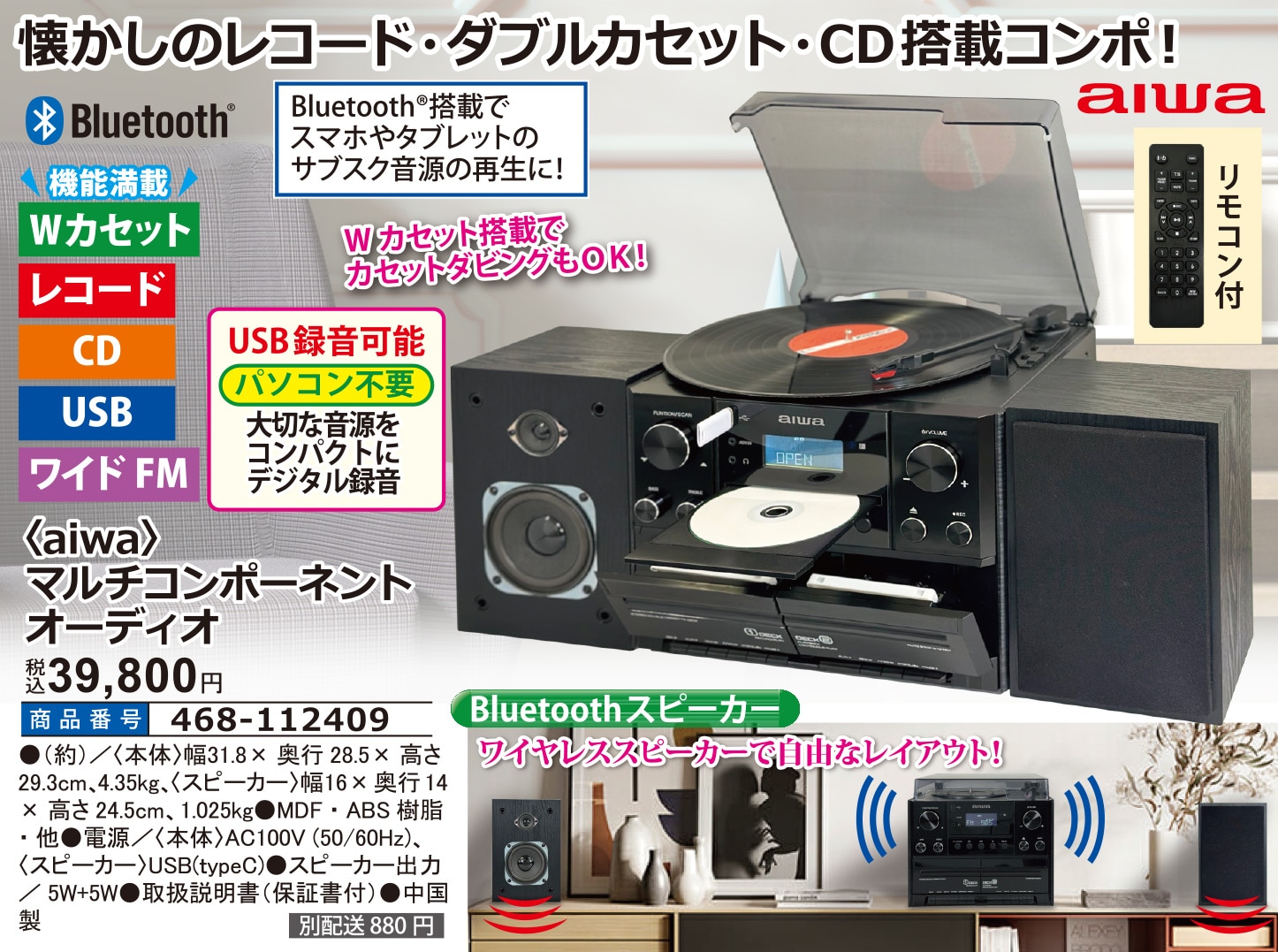 Bluetooth搭載でスマホやタブレットのサブスク音源の再生に! Wカセット搭載でカセットダビングもOK! USB録音可能 パソコン不要 大切な音源をコンパクトにデジタル録音。 機能満載 Wカセット・レコード・CD・USB・ワイドFM ワイヤレススピーカーで自由なレイアウト!