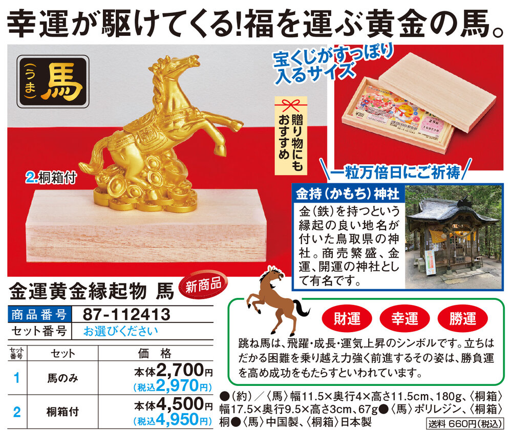 幸運が駆けてくる!福を運ぶ黄金の馬! 宝くじがすっぽり入るサイズ ●贈り物にもおすすめ \一粒万倍日にご祈祷/ 【金持(かもち)神社】 金(鉄)を持つという縁起の良い地名が付いた鳥取県の神社。 商売繁盛、金運、開運の神社として有名です。 ●財運 ●幸運 ●勝運 跳ね馬は、飛躍・成長・運気上昇のシンボルです。 立ちはだかる困難を乗り越え力強く前進するその姿は、勝負運を高め成功をもたらすといわれています。