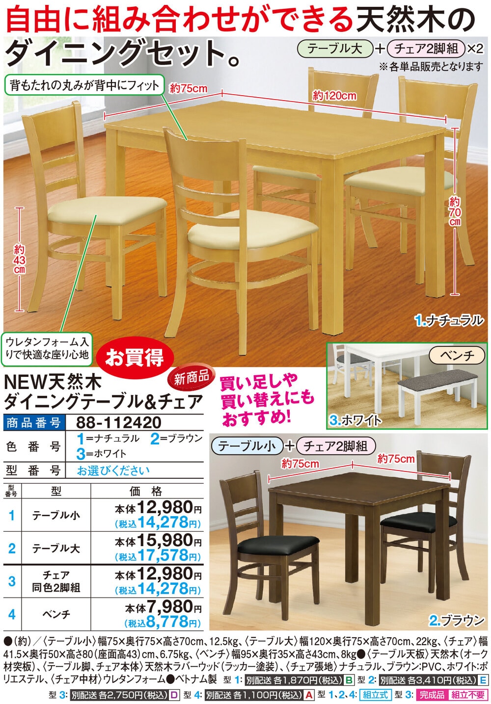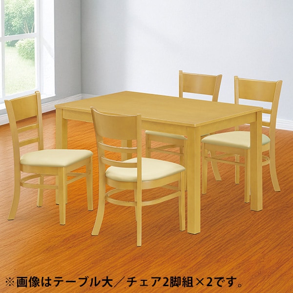 ●<テーブル天板>天然木(オーク材突板)、<テーブル脚、チェア本体>天然木ラバーウッド(ラッカー塗装)、<チェア張地>ナチュラル、ブラウン:PVC、ホワイト:ポリエステル、<チェア中材>ウレタンフォーム