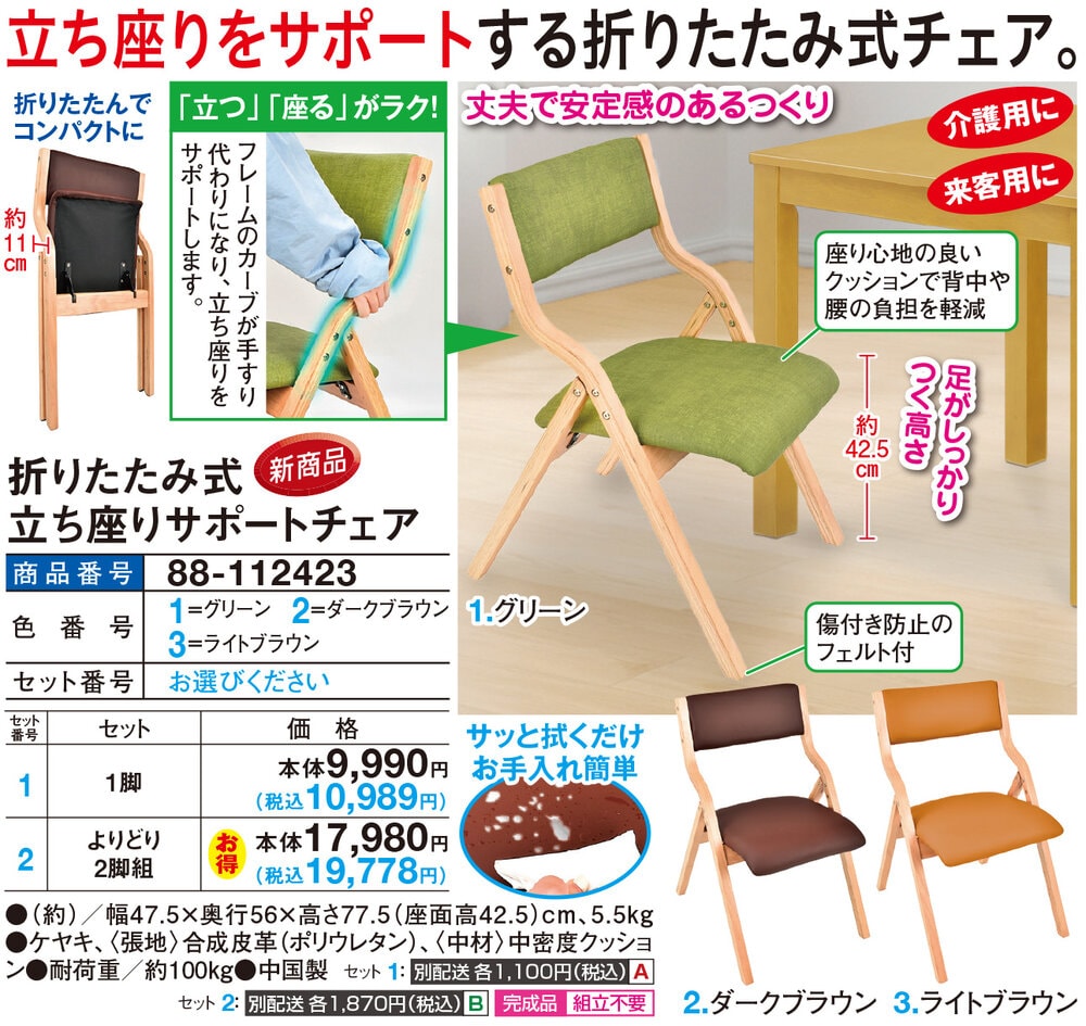 立ち座りをサポートする折りたたみ式チェア! 【食を楽しむ!】 手軽に便利!毎日の食卓 ~キッチン~ 折りたたんでコンパクトに 丈夫で安定感のあるつくり 足がしっかりつく高さ 【「立つ」「座る」がラク!】 フレームのカーブが手すり代わりになり、立ち座りをサポートします。 座り心地の良いクッションで背中や腰の負担を軽減 傷付き防止のフェルト付 サッと拭くだけお手入れ簡単 ●介護用に ●来客用に