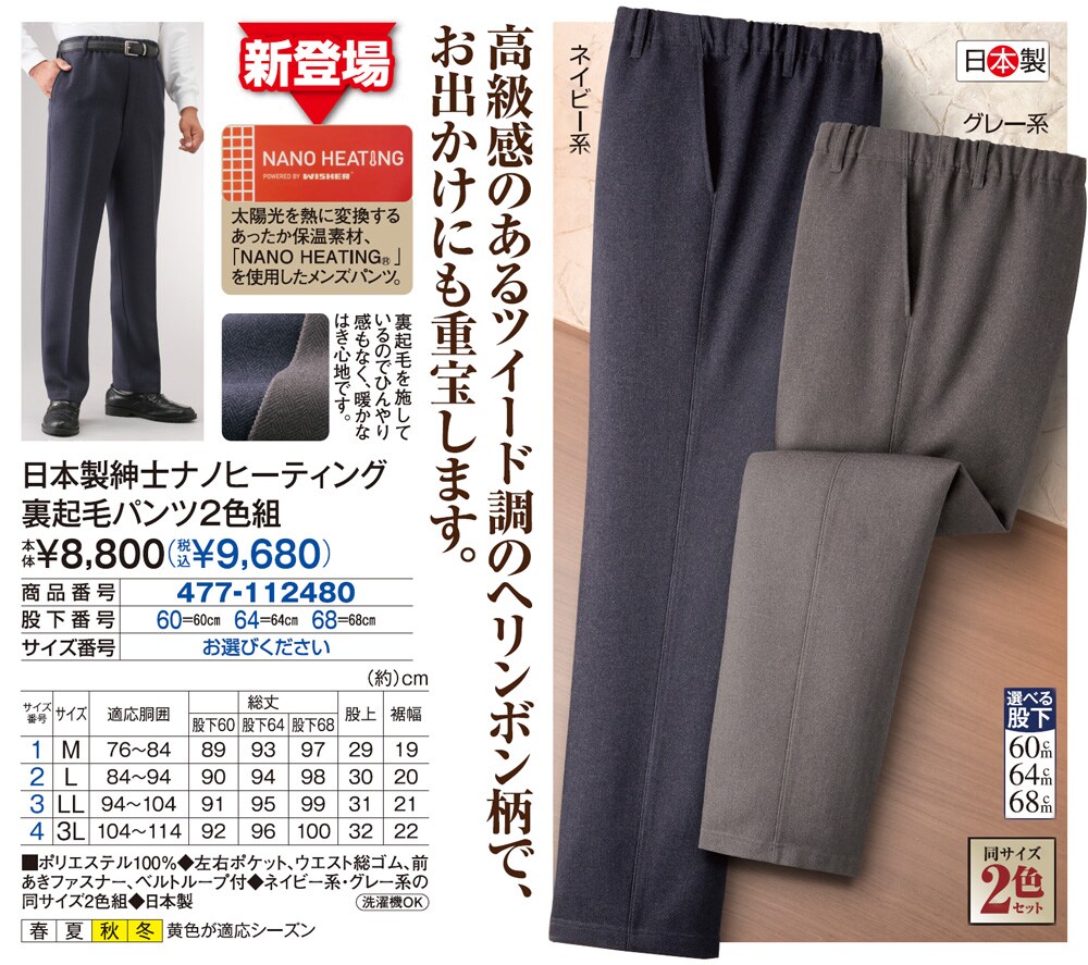 日本製紳士ナノヒーティング裏起毛パンツ2色組