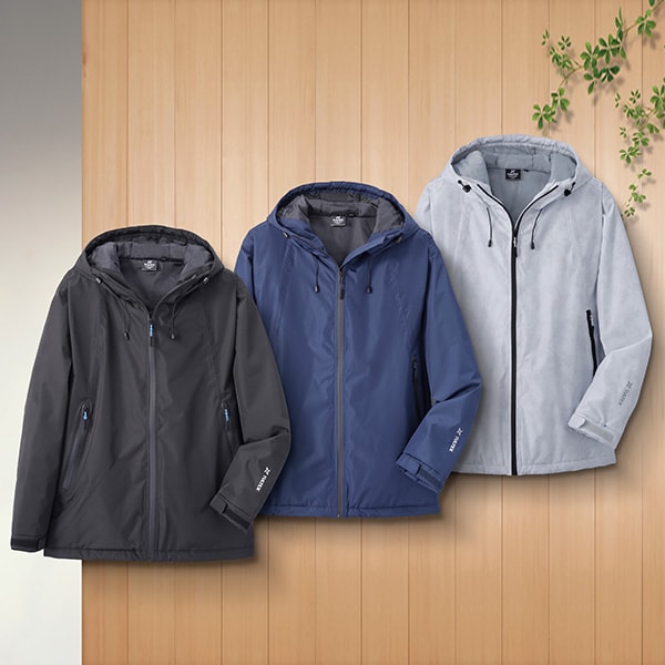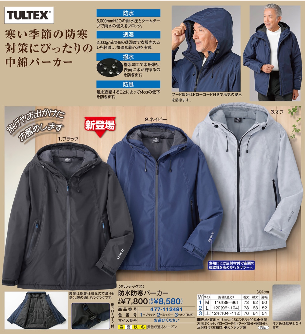寒い季節の防寒対策にぴったりの中綿パーカー フード部分はドローコード付きで冷気の侵入を防ぎます。 左袖口には反射材付で夜間の視認性を高め歩行をサポート。 裏側は総裏仕様なので滑りも良く、腕の通しもラクラクです。 オフ色は総柄となります。 防水 5,000mmH2Oの耐水圧とシームテープで雨水の侵入をブロック。 透湿 2,000g/㎡/24hの透湿度で衣服内のムレを軽減し、快適な着心地を実現。 撥水 撥水加工で水を弾き、表面に水が貯まるのを防ぎます。 防風 風を遮断することによって体力の低下を防ぎます。