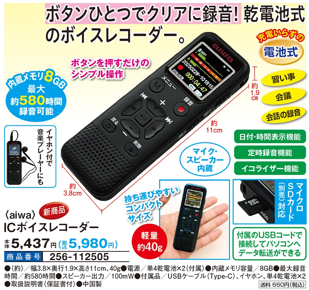 ●(約)/幅3.8×奥行1.9×高さ11cm、40g ●電源/単4乾電池×2(付属) ●内蔵メモリ容量/8GB ●最大録音時間/約580時間 ●スピーカー出力/100mW ●付属品/USBケーブル(Type-C)、イヤホン、単4乾電池×2 ●取扱説明書(保証書付) ●中国製