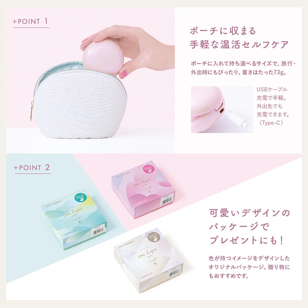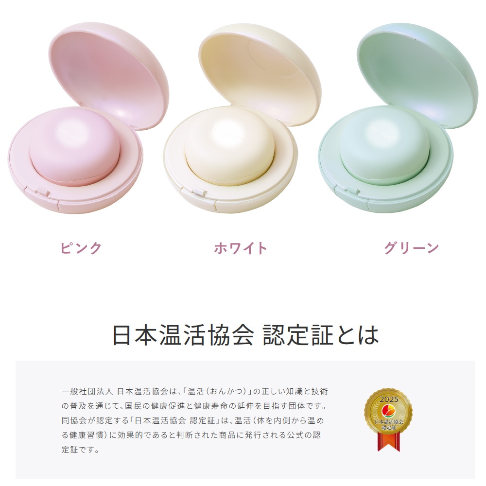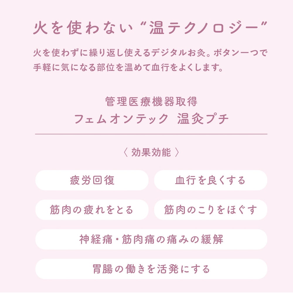 【品名】フェムオンテック 温灸プチ 【品番】AX-HJ155pk、AX-HJ155wh、AX-HJ155gn 【一般的名称】温灸器 【販売名】温灸 J55 【医療機器認証番号】304AKBZX00027A02 【使用目的又は効果】局所への加熱による灸の代用。一般家庭で使用すること。(疲労回復、血行を良くする、筋肉の疲れをとる、筋肉のこりをほぐす、神経痛・筋肉痛の痛みの緩解、胃腸の働きを活発にする) 【素材】<本体>ポリカーボネート、鉄、シリコーンゴム <充電ケース>ABS樹脂 【電源】AC100V 50/60Hz 【ヒーター最高温度】約56℃以下 【充電所要時間】約2時間 【連続使用可能時間】約2時間 【タイマー】約15分自動オフ 【使用電池】リチウムイオン充電池 【サイズ・重量(約)】<本体>φ46×H22mm、30g(アダプター含まず)<充電ケース>φ70×H39mm、43g 【電源コード(約)】80cm 【付属品】充電ケース、ACアダプター、充電ケーブル、粘着シール(無香12枚) 【生産国】中国 【保証期間】1年