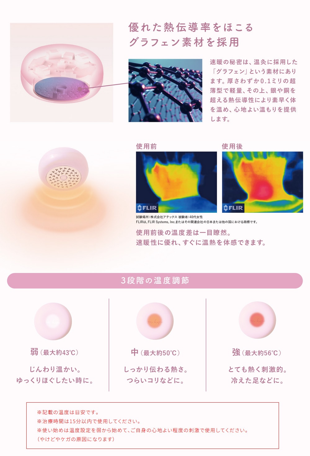 ※温度調節の温度は目安です。 ※治療時間は15分以内で使用してください。 ※使い始めは温度設定を弱から始めて、ご自身の心地よい程度の刺激で使用してください。やけどやケガの原因になります。