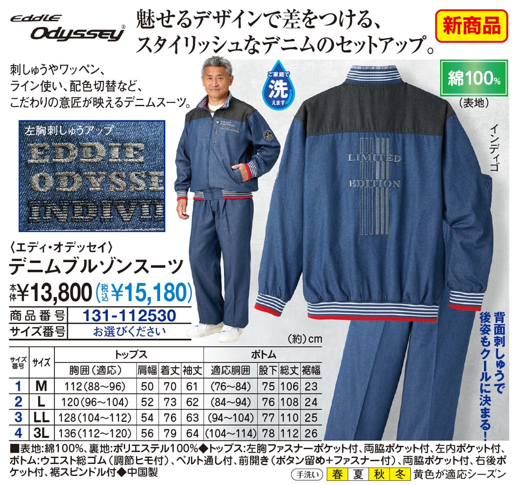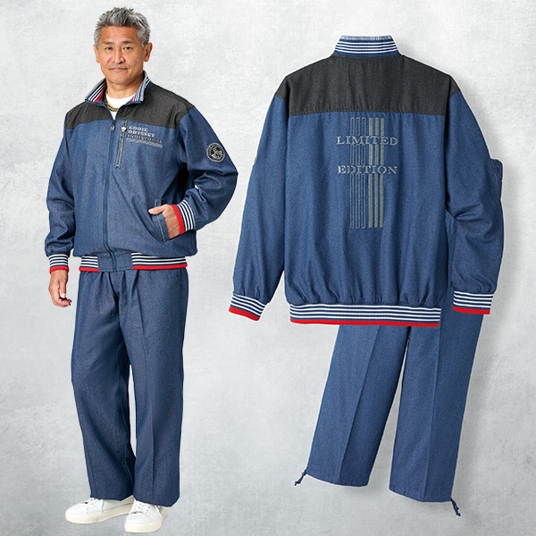 魅せるデザインで差をつける、スタイリッシュなデニムのセットアップ! 刺しゅうやワッペン、ライン使い、配色切替など、こだわりの意匠が映えるデニムスーツ。 背面刺しゅうで後姿もクールに決まる! ●綿100%(表地)