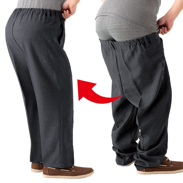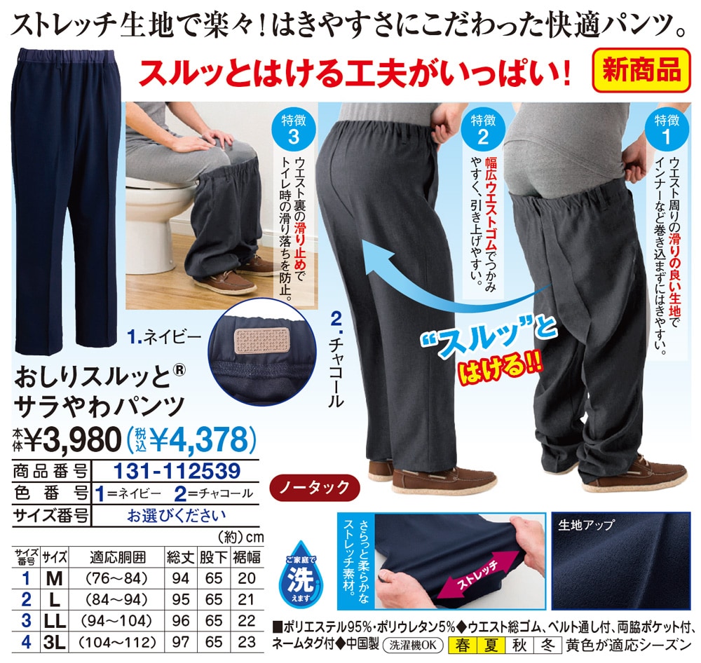 ストレッチ生地で楽々!はきやすさにこだわった快適パンツ! スルッとはける工夫がいっぱい! さらっと柔らかなストレッチ素材。 “スルッ”とはける!! 【特徴1】 ウエスト周りの滑りの良い生地でインナーなど巻き込まずにはきやすい。 【特徴2】 幅広ウエストゴムでつかみやすく、引き上げやすい。 【特徴3】 ウエスト裏の滑り止めでトイレ時の滑り落ちを防止。 ●ノータック ●ストレッチ