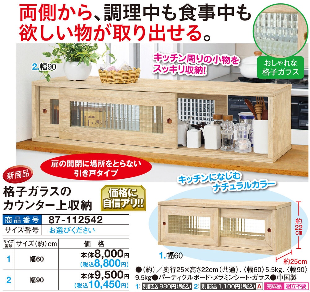 両側から、調理中も食事中も欲しい物が取り出せる! キッチン周りの小物をスッキリ収納! ●扉の開閉に場所をとらない引き戸タイプ ●おしゃれな格子ガラス ●キッチンになじむナチュラルカラー