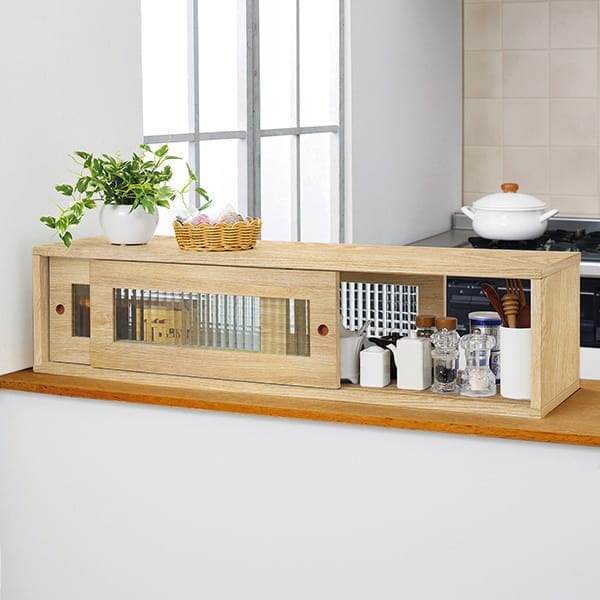 両側から、調理中も食事中も欲しい物が取り出せる! キッチン周りの小物をスッキリ収納! ●扉の開閉に場所をとらない引き戸タイプ ●おしゃれな格子ガラス ●キッチンになじむナチュラルカラー