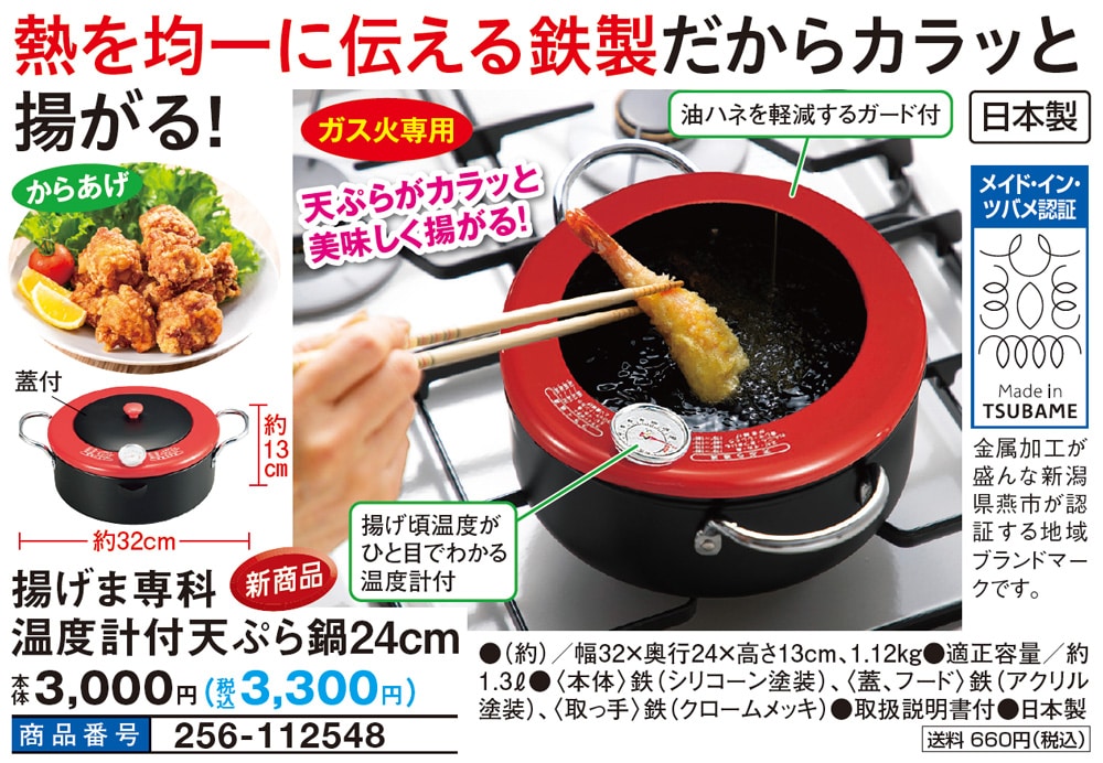 熱を均一に伝える鉄製だからカラッと揚がる! 天ぷら、からあげがカラッと美味しく揚がる! ●ガス火専用 ●蓋付 【メイド・イン・ツバメ認証】 金属加工が盛んな新潟県燕市が認証する地域ブランドマークです。 油ハネを軽減するガード付 揚げ頃温度がひと目でわかる温度計付