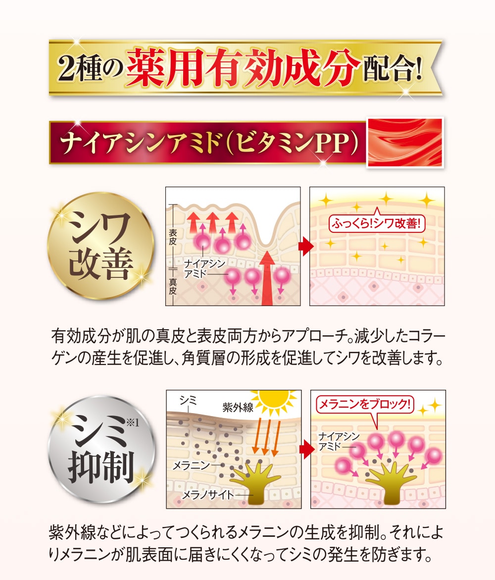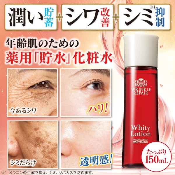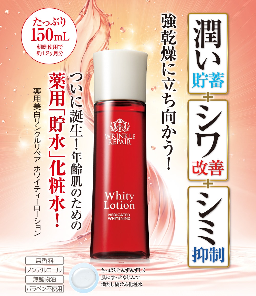 ●内容量/150mL(朝晩使用で約1.2ヶ月分) ●販売名:リンクルリペア美白化粧水 ●原産国:日本 ●主な配合成分 【有効成分】ナイアシンアミド、グリチルリチン酸2K 【その他の主な成分】プラセンタエキス(1)、湯原温泉水、ハトムギ発酵液、コメ発酵液、豆乳発酵液、ローヤルゼリー発酵液、ユズセラミド、パイナップルセラミド、N-ステアロイルジヒドロスフィンゴシン、ステアロイルフィトスフィンゴシン、N-ステアロイルフィトスフィンゴシン、ヒドロキシステアリルフィトスフィンゴシン、ステアロイルオキシヘプタコサノイルフィトスフィンゴシン、ブリエラスチン、加水分解サケ卵巣膜抽出液、異性化糖、ビタミンC・2-グルコシド、ビタミンA油、天然ビタミンE、トリメチルグリシン、オリーブ油脂肪酸セトステアリル・オリーブ油脂肪酸ソルビット混合物