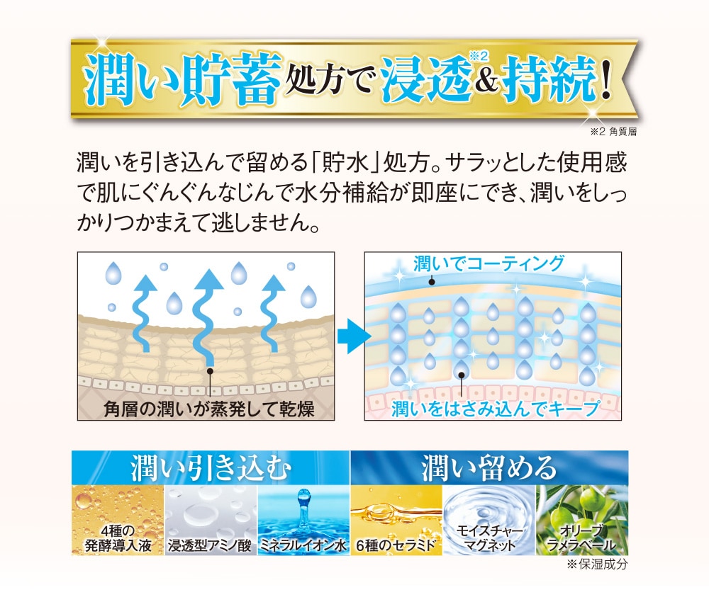 潤い貯蓄+シワ改善+シミ抑制 年齢肌のための薬用貯水化粧水 ■こんな方におすすめ ・乾燥が気になる ・目もと口もとの小ジワが気になる ・シミが気になる ■2種の薬用有効成分配合 ・ナイアシンアミド:コラーゲン生成を促進しシワを改善 ・グリチルリチン酸ジカリウム:肌あれ防止 ■シミ抑制 ・メラニンの生成を抑え、シミ・そばかすを防ぐ ■潤い貯蓄処方 ・潤いを引き込み、抱え込む ・しっとりとしたハリのある肌へ ◎オールインワンゲル前の使用がおすすめ! ◎医薬部外品 ◎たっぷり150mL(朝晩使用で約1.2ヶ月分)