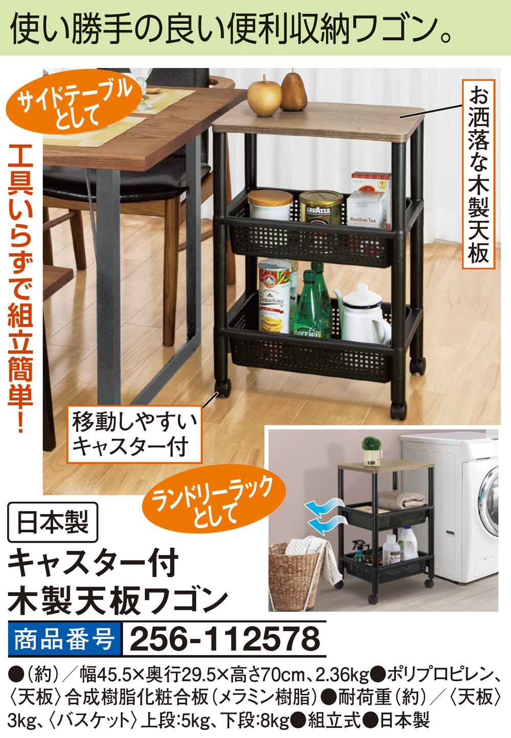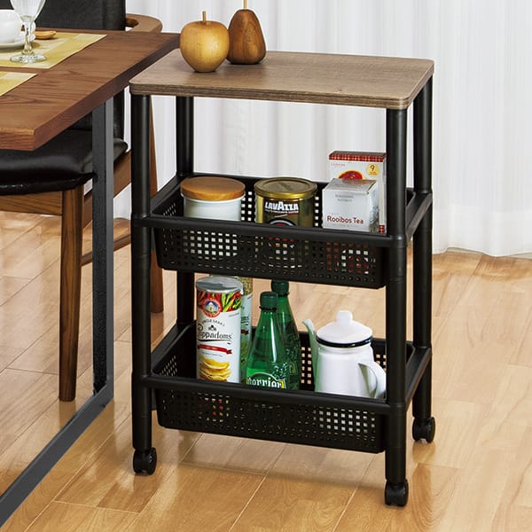 使い勝手の良い便利収納ワゴン! お洒落な木製天板 工具いらずで組立簡単! 移動しやすいキャスター付 ●サイドテーブルとして ●ランドリーラックとして