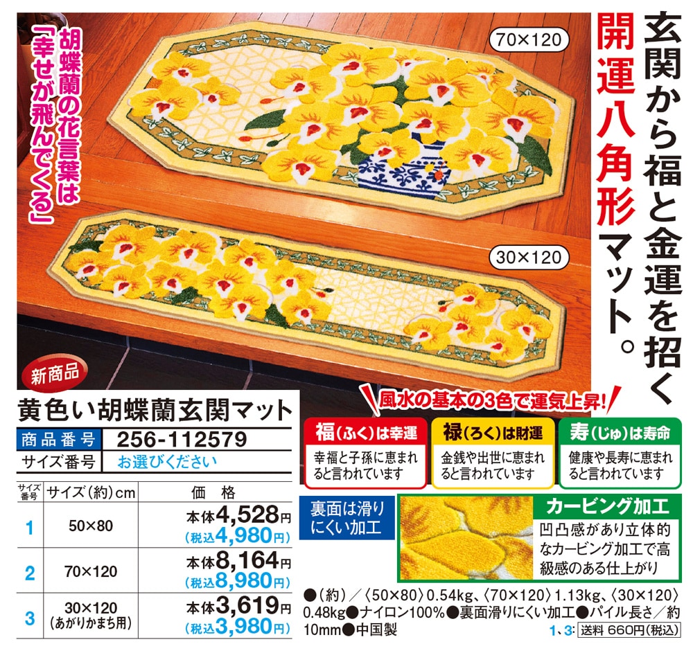 玄関から福と金運を招く開運八角形マット! 胡蝶蘭の花言葉は「幸せが飛んでくる」 \風水の基本の3色で運気上昇!/ 【福(ふく)は幸運】 幸福と子孫に恵まれると言われています 【禄(ろく)は財運】 金銭や出世に恵まれると言われています 【寿(じゅ)は寿命】 健康や長寿に恵まれると言われています 【カービング加工】 凹凸感があり立体的なカービング加工で高級感のある仕上がり 裏面は滑りにくい加工