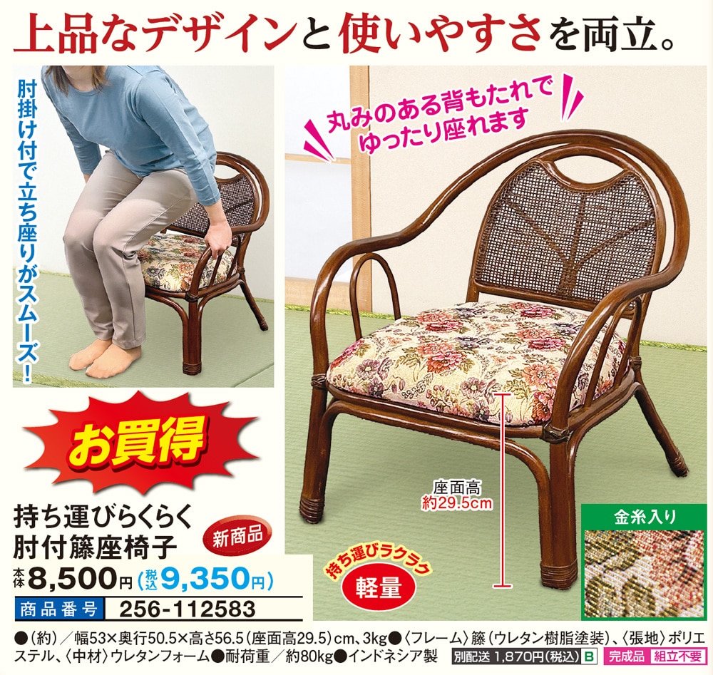 上品なデザインと使いやすさを両立! 丸みのある背もたれでゆったり座れます 肘掛け付で立ち座りがスムーズ! ・座面高約29.5cm ・金糸入り 【軽量】 持ち運びラクラク