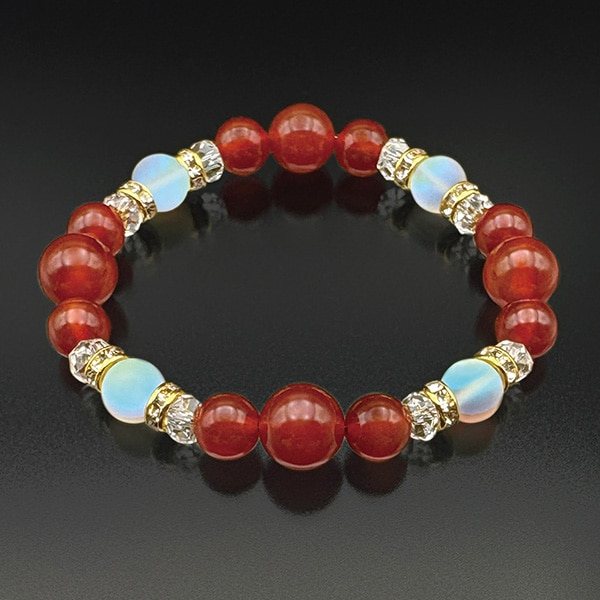 ■赤めのう(10mm珠・8mm珠)・ガラスビーズ(ルナフラッシュ8mm珠)・白水晶(6×3mmカット珠)、台座部:真鍮・ラインストーン、中糸:ポリウレタンゴム ◆(約)/内周16cm、17g ◆巾着袋付 ◆日本製