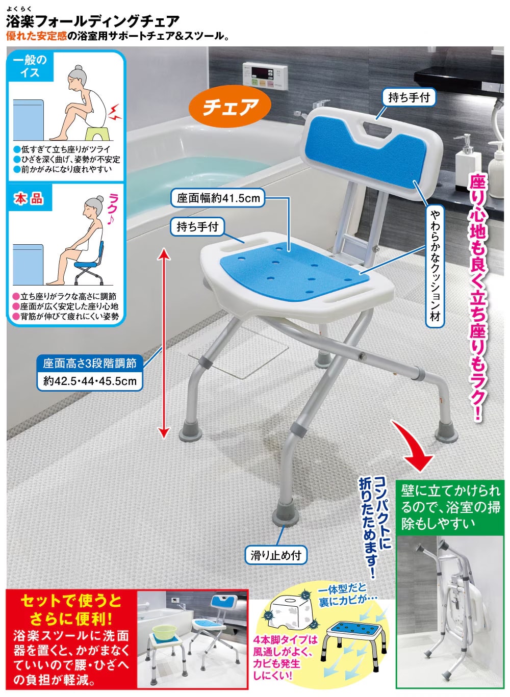 高さ調節ができて優れた安定感のサポートチェア! 人気の浴楽シリーズがリニューアル! 座り心地も良く安定感抜群! コンパクトに折りたためます! 壁に立てかけられるので、浴室の掃除もしやすい 立ち座りラクラク♪ 一体型だと裏にカビが・・・4本脚タイプは風通しがよく、カビも発生しにくい! 【一般のイス】 ・低すぎて立ち座りがツライ ・ひざを深く曲げ、姿勢が不安定 ・前かがみになり疲れやすい 【本品】 ・立ち座りがラクな高さに調節 ・座面が広く安定した座り心地 ・背筋が伸びて疲れにくい姿勢 【浴楽スツールとセットで使うとさらに便利!】 浴楽スツールに洗面器を置くと、かがまなくていいので腰・ひざへの負担が軽減。 ●持ち手付 ●やわらかなクッション材 ●座面幅約41.5cm ●滑り止め付