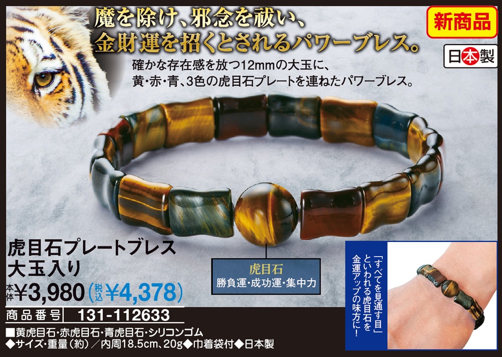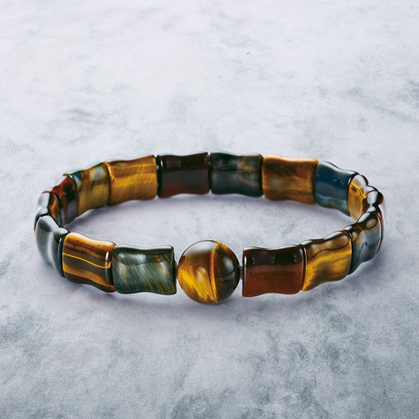 魔を除け、邪念を祓い、金財運を招くとされるパワーブレス! 確かな存在感を放つ12mmの大玉に、黄・赤・青、3色の虎目石プレートを連ねたパワーブレス。 【虎目石】勝負運・成功運・集中力 「すべてを見通す目」といわれる虎目石を金運アップの味方に!