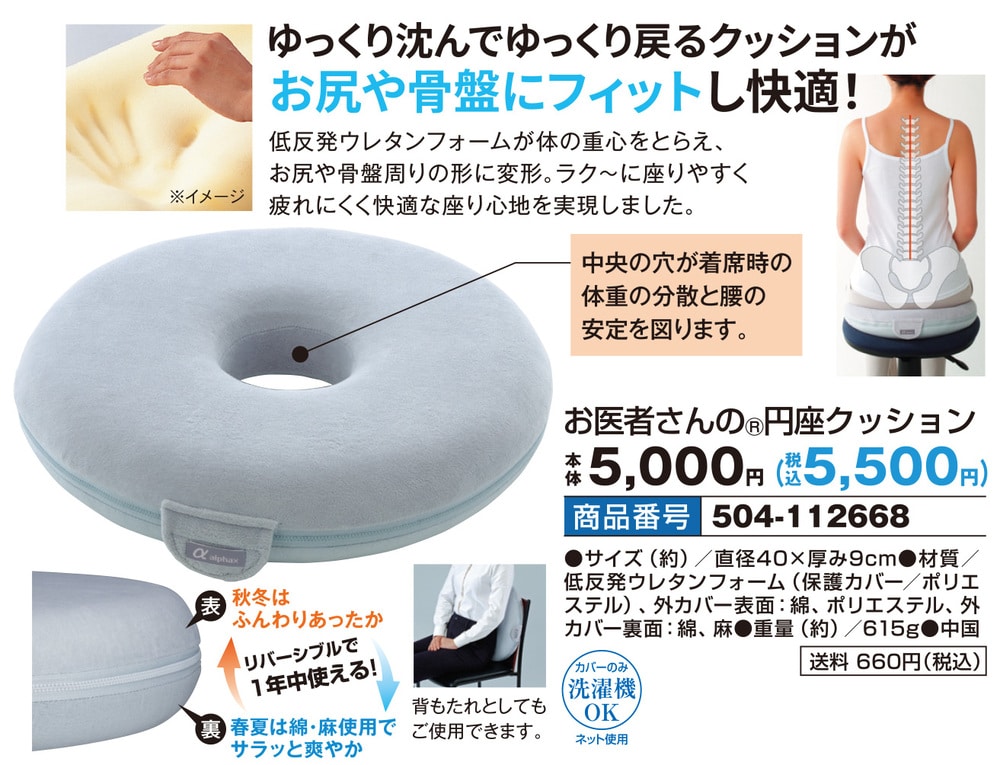 ●低反発ウレタンフォームが体の重心をとらえ、お尻や骨盤周りの形に変形。ラク~に座りやすく疲れにくく快適な座り心地を実現しました。 ●中央の穴が着席時の体重の分散と腰の安定を図ります。 【表】 秋冬はふんわりあったか 【裏】 春夏は綿・麻使用でサラッと爽やか ●背もたれとしてもご使用できます。