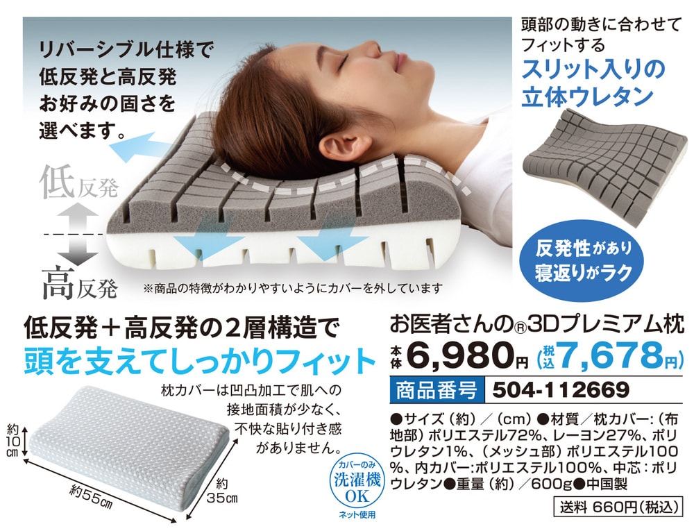 ●頭部の動きに合わせてフィットするスリット入りの立体ウレタン ●リバーシブル仕様で低反発と高反発 お好みの固さを選べます。 ●反発性があり寝返りがラク ●枕カバーは凹凸加工で肌への接地面積が少なく、不快な貼り付き感がありません。