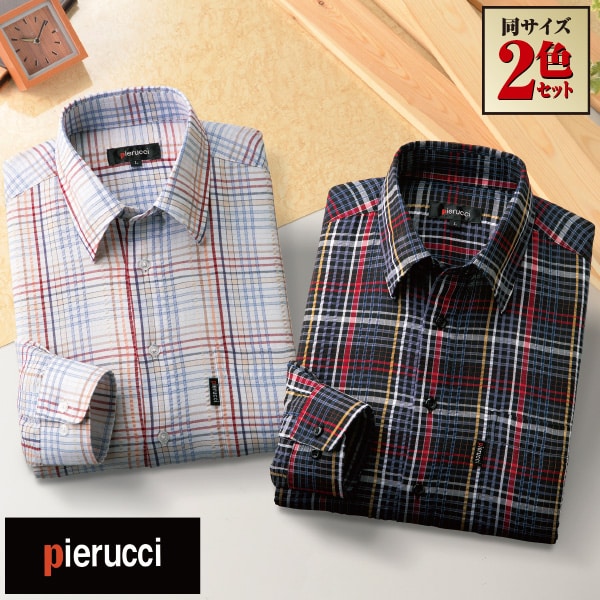 軽やかなサッカー生地を使用した、チェック柄の長袖シャツ2色セット。 ポリエステルと綿の混紡素材で、通気性と肌触りの良さを両立。春から秋口まで活躍します。 さらりと素肌に心地良いサッカー生地。定番カラーの2色組で着回し力抜群。