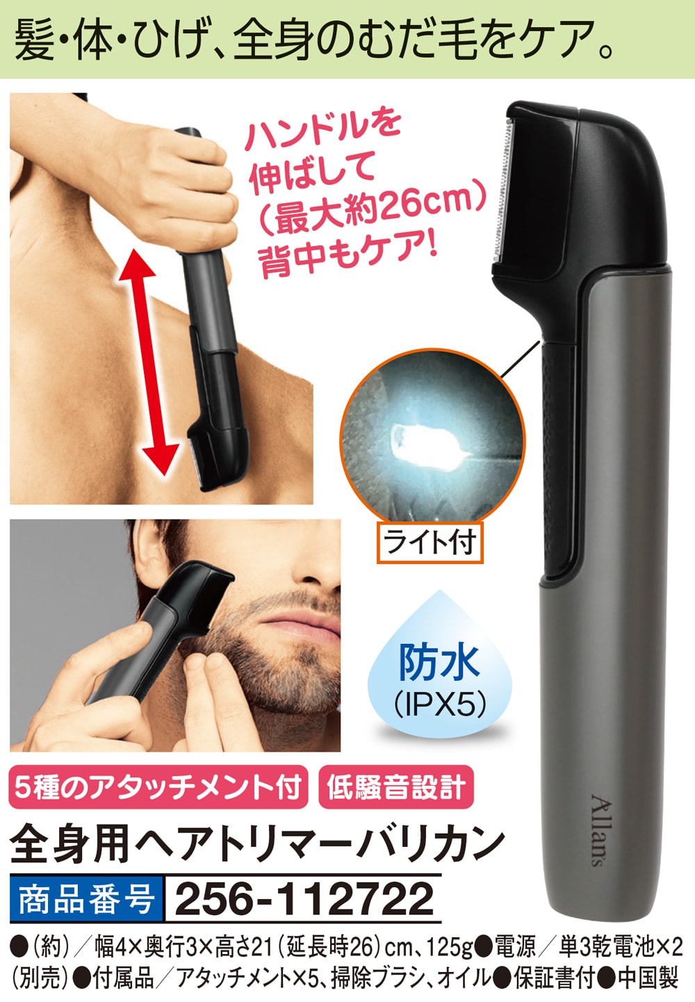 髪・体・ひげ、全身のむだ毛をケア! ハンドルを伸ばして(最大約26cm)背中もケア! ライト付 ●防水(IPX5) ●5種のアタッチメント付 ●低騒音設計