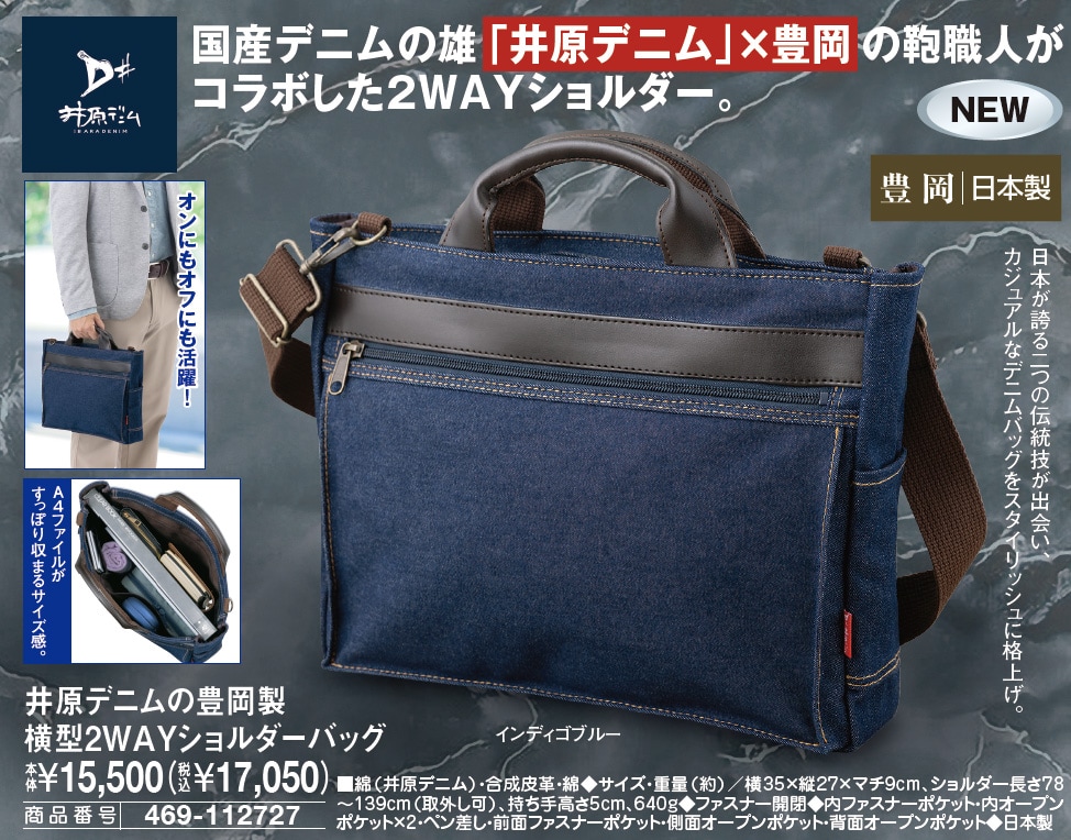 国産デニムの雄「井原デニム」×豊岡の鞄職人がコラボした2WAYショルダー。 日本が誇る二つの伝統技が出会い、カジュアルなデニムバッグをスタイリッシュに格上げ。オンにもオフにも活躍!A4ファイルがすっぽり収まるサイズ感。