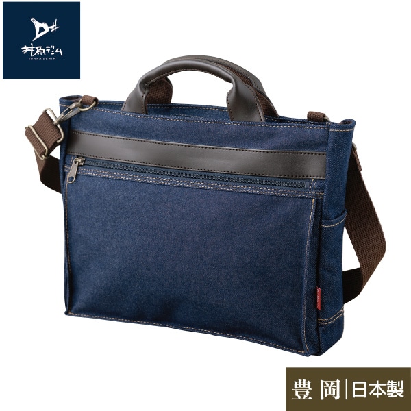 ●綿(井原デニム)・合成皮革・綿 ◆サイズ・重量(約)/横35×縦27×マチ9cm、ショルダー長さ78~139cm(取外し可)、持ち手高さ5cm、640g ◆ファスナー開閉 ◆内ファスナーポケット・内オープンポケット×2・ペン差し・前面ファスナーポケット・側面オープンポケット・背面オープンポケット ◆日本製